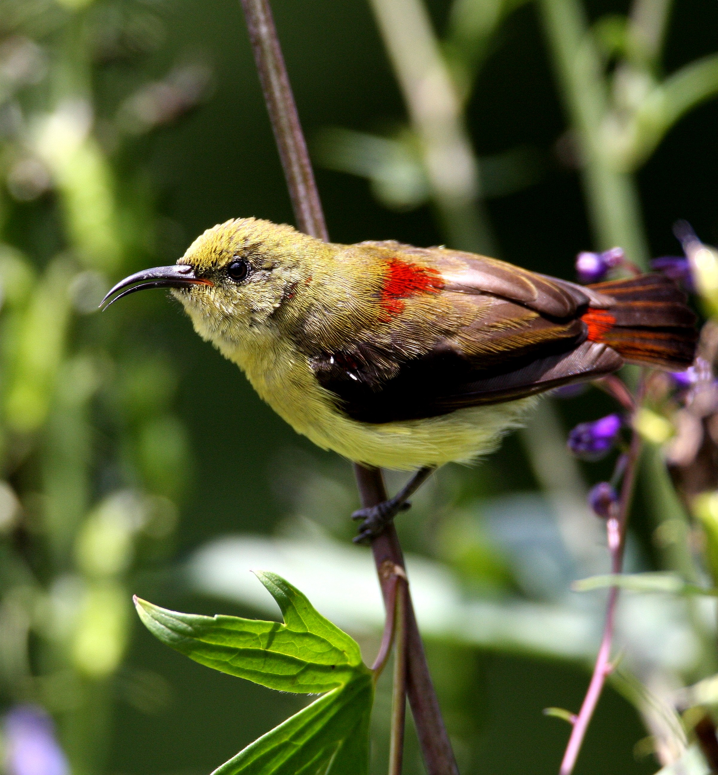 Crimson-backed sunbird in Ooty summer. Dozens of them were hopping amoung these blue flowers, few feet from the ground, dipping their beaks in and guzzling nectar.